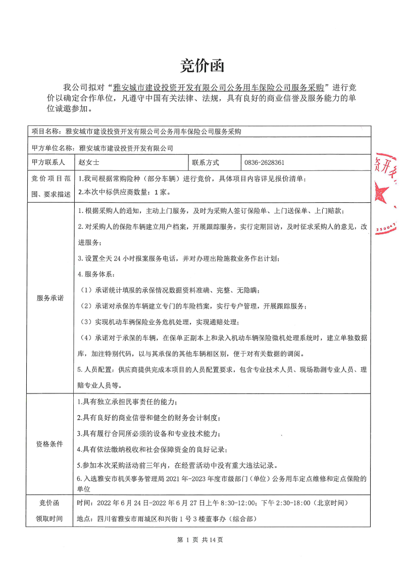雅安城市建設(shè)投資開發(fā)有限公司公務(wù)用車保險公司服務(wù)采購競價公告