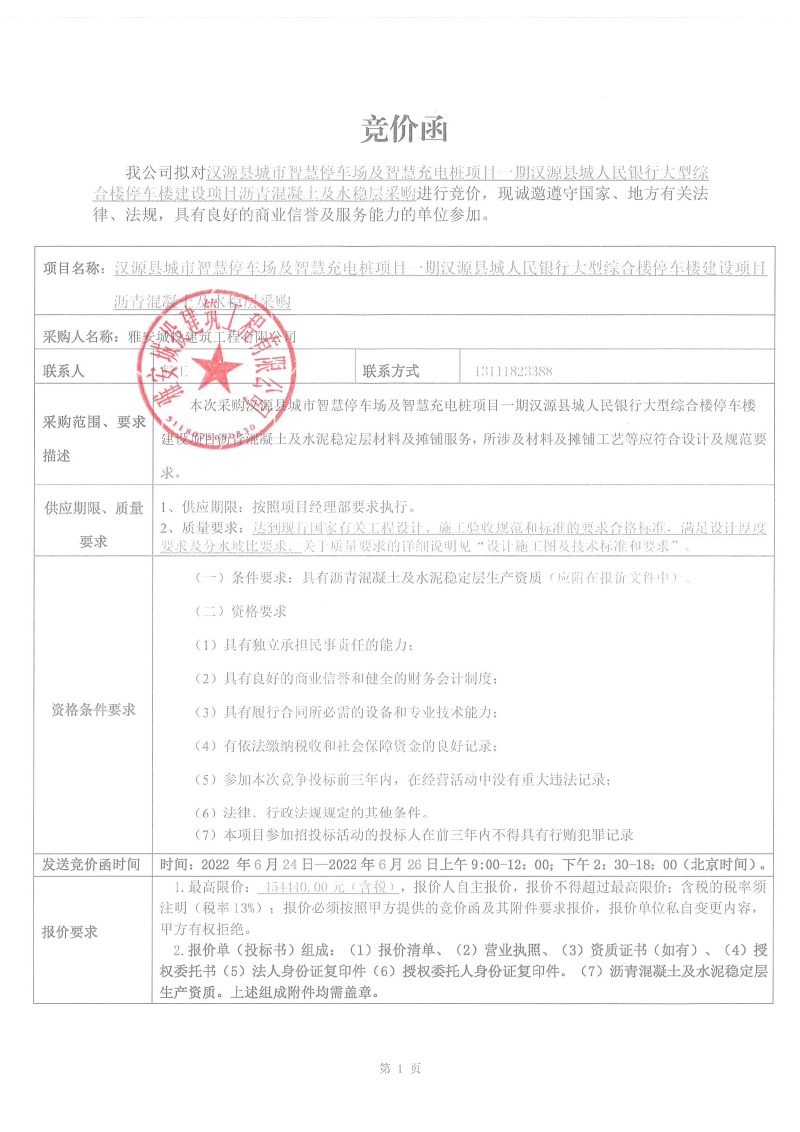 漢源縣城市智慧停車場及智慧充電樁項(xiàng)目一期漢源縣城人民銀行大型綜合樓停車樓建設(shè)項(xiàng)目瀝青混凝土、水穩(wěn)層采購競價公告