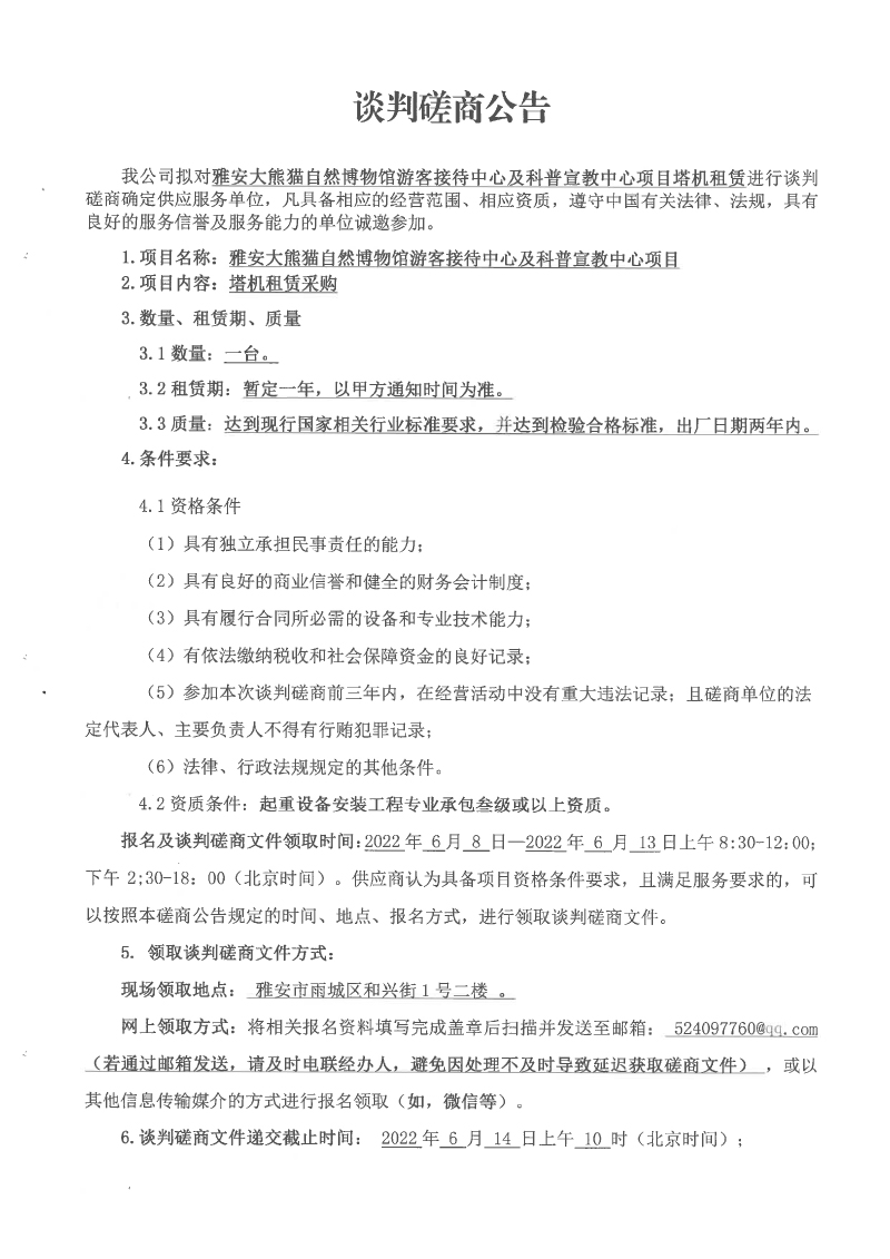 雅安大熊貓自然博物館游客接待中心及科普宣教中心項(xiàng)目塔機(jī)租賃談判磋商公告