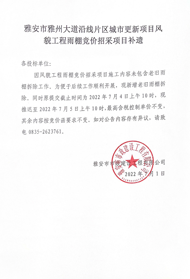 雅安市雅州大道沿線片區(qū)城市更新項目風貌工程雨棚競價招采項目補遺