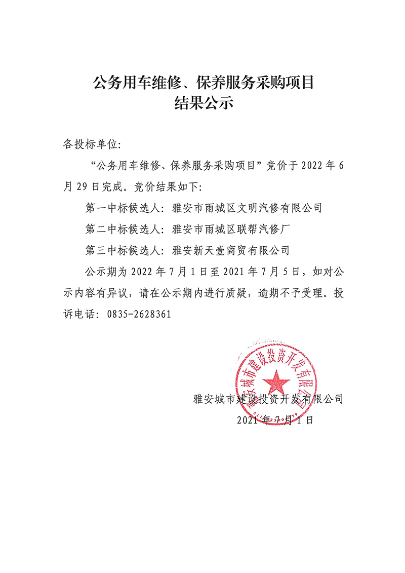 雅安城市建設(shè)投資開發(fā)有限公司 公務(wù)用車維修、保養(yǎng)服務(wù)采購項目結(jié)果公示