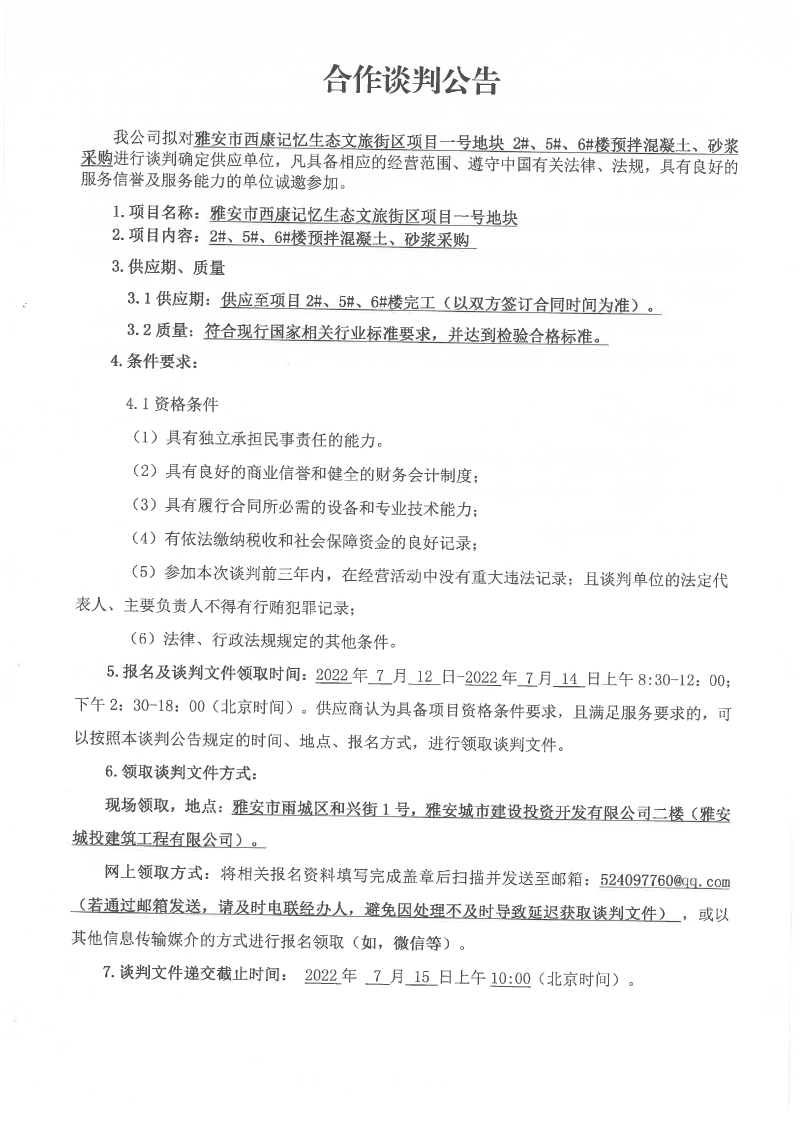 雅安市西康記憶生態(tài)文旅街區(qū)項(xiàng)目一號(hào)地塊2#、5#、6#樓預(yù)拌混凝土、砂漿采購合作談判公告
