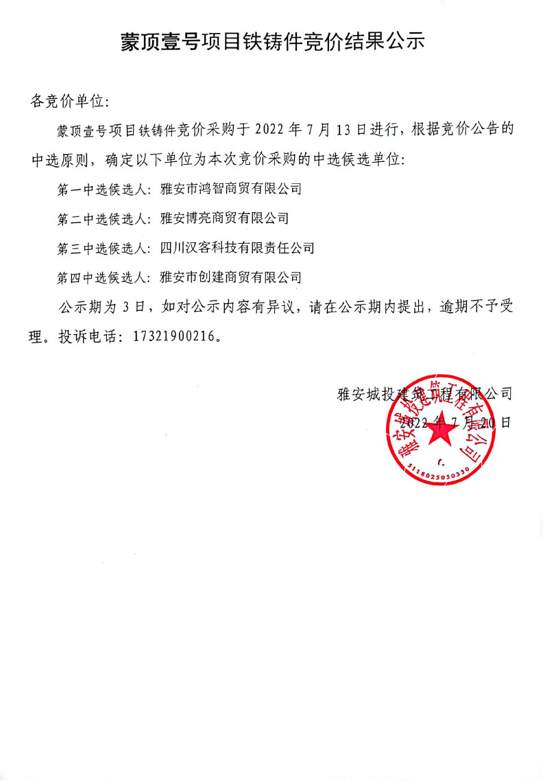 蒙頂壹號項目鐵鑄件競價結果公示