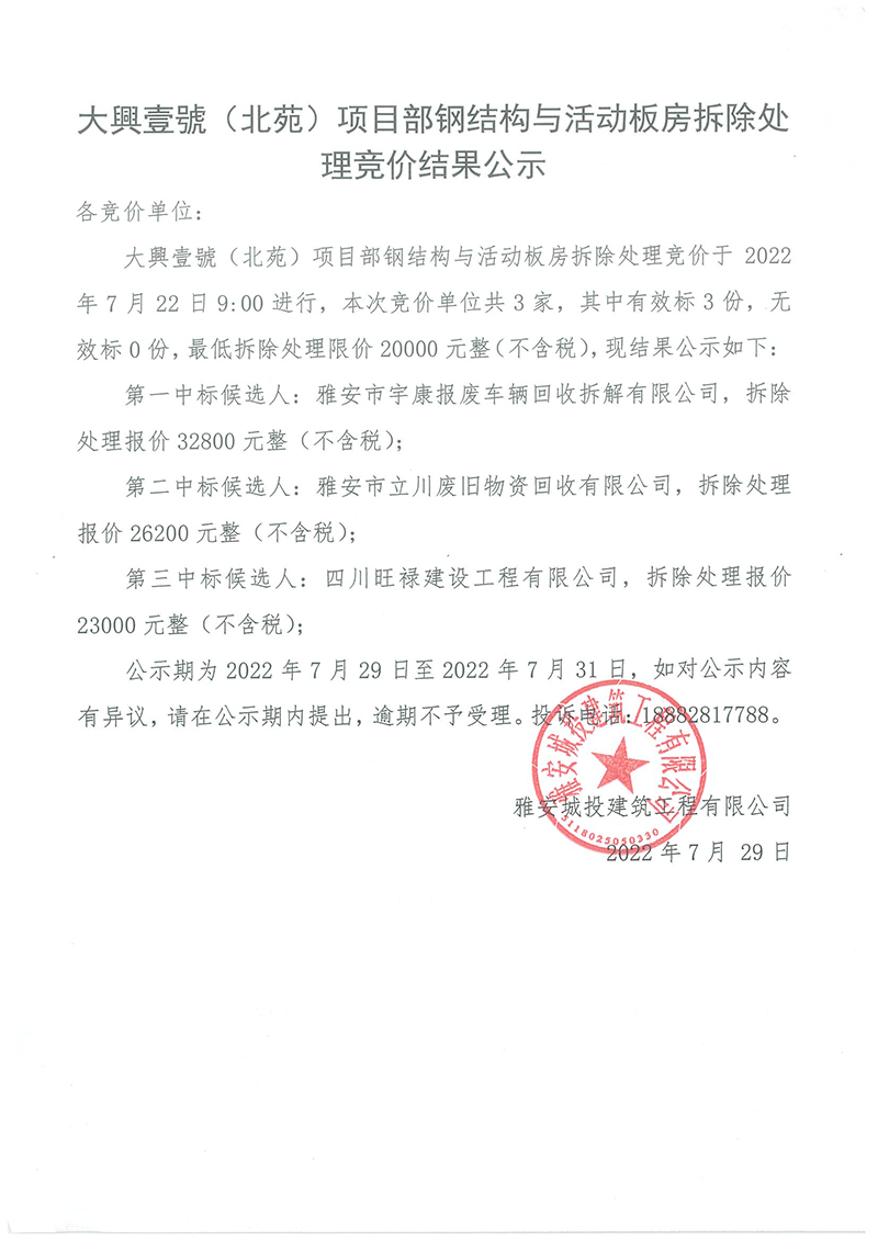 大興壹號(北苑)鋼結構與活動板房拆除處理競價結果公示