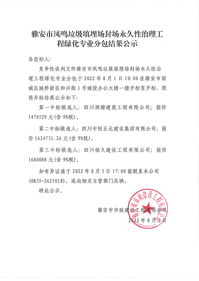 雅安市鳳鳴垃圾填埋場(chǎng)封場(chǎng)永久性治理工程項(xiàng)目綠化專(zhuān)業(yè)分包結(jié)果公示