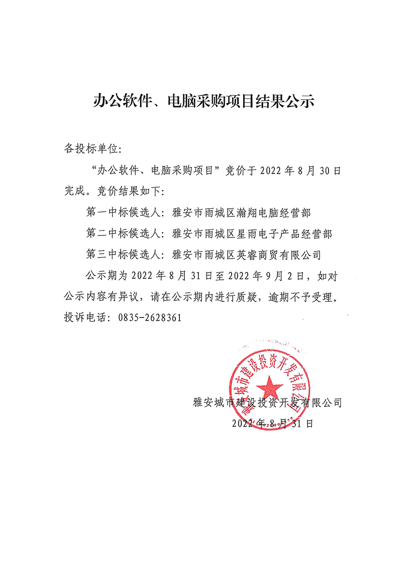 雅安城市建設(shè)投資開發(fā)有限公司辦公軟件、電腦采購項目結(jié)果公示