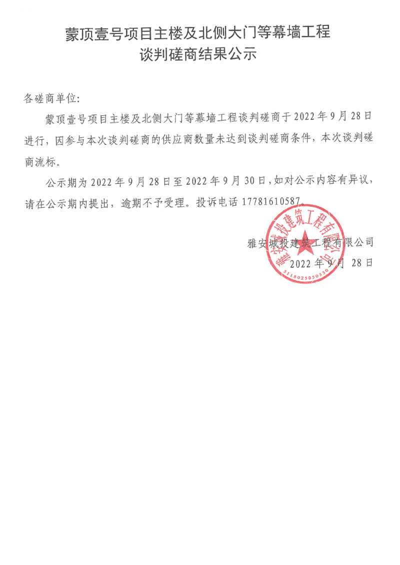 蒙頂壹號(hào)項(xiàng)目主樓及北側(cè)大門等幕墻工程談判磋商結(jié)果公示