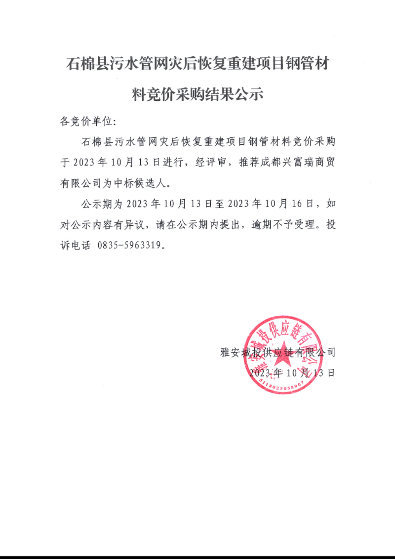 石棉縣污水管網(wǎng)災后恢復重建項目鋼管材料競價采購結果公示
