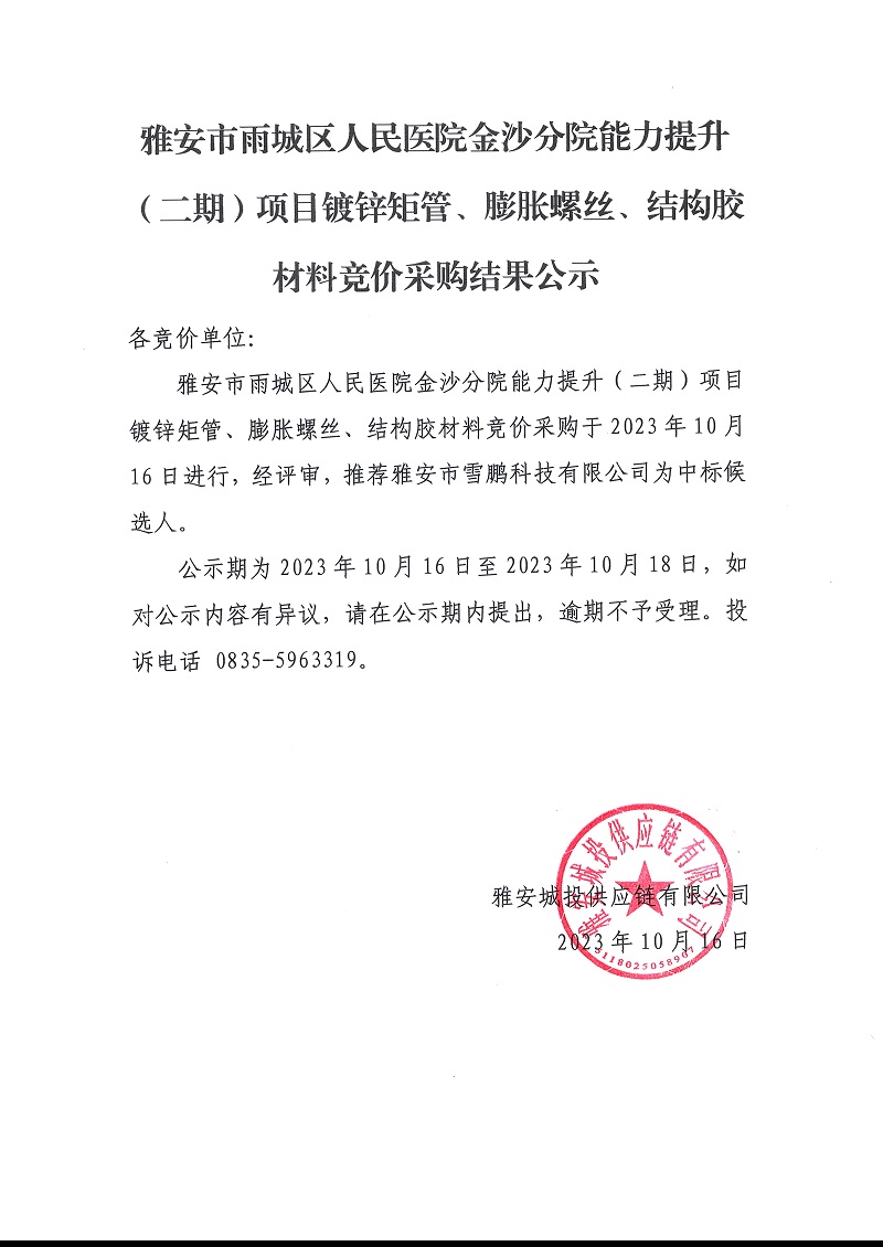 雅安市雨城區(qū)人民醫(yī)院金沙分院能力提升(二期)項(xiàng)目鍍鋅矩管、膨脹螺絲、結(jié)構(gòu)膠材料競(jìng)價(jià)采購(gòu)結(jié)果公示