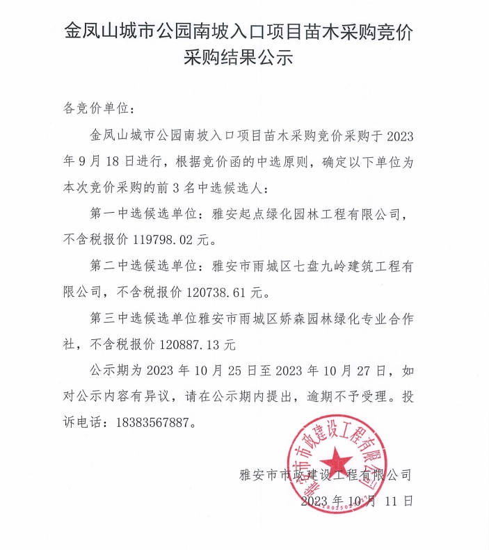 金鳳山城市公園南坡入口項(xiàng)目苗木采購(gòu)競(jìng)價(jià)采購(gòu)結(jié)果公示