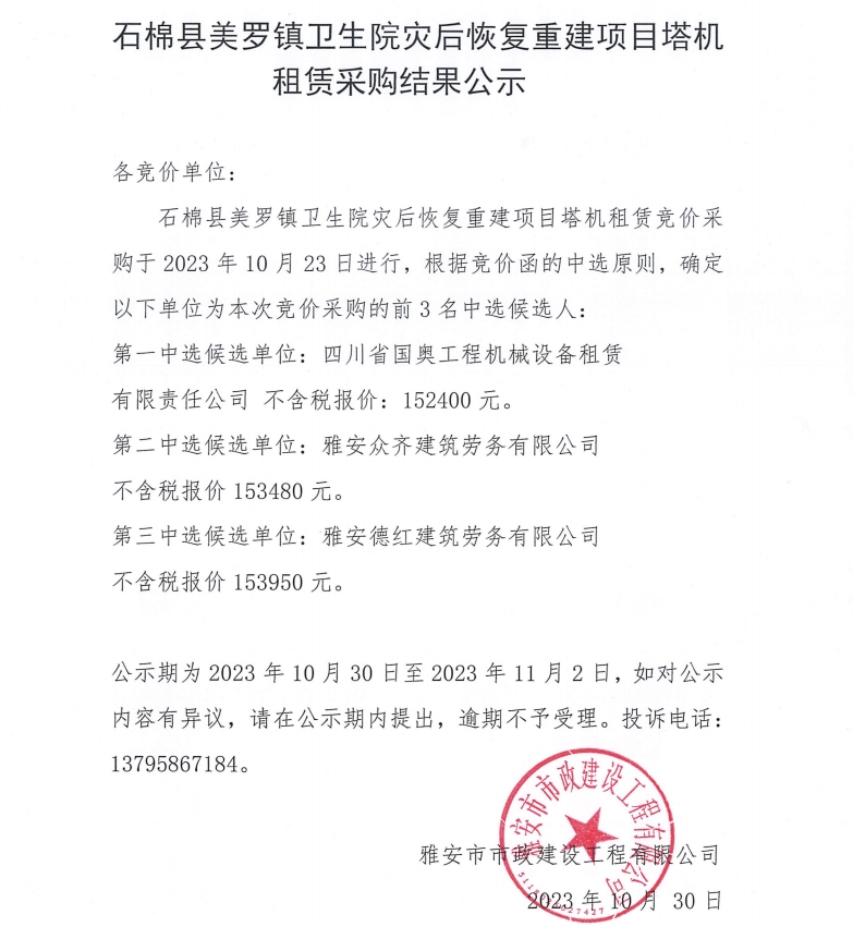 石棉縣美羅鎮(zhèn)衛(wèi)生院災(zāi)后恢復(fù)重建項(xiàng)目塔機(jī)租賃采購(gòu)結(jié)果公示
