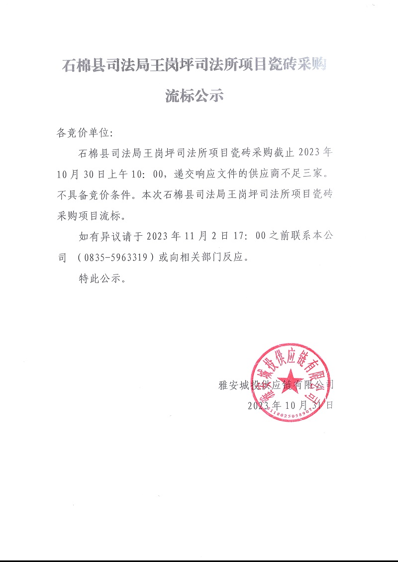 石棉縣司法局王崗坪司法所項(xiàng)目瓷磚采購(gòu)流標(biāo)公示