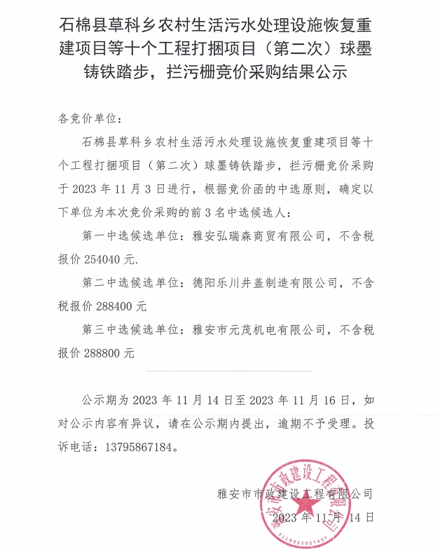 石棉縣草科鄉(xiāng)農(nóng)村生活污水處理設施恢復重建項目等十個工程打捆項目(第二次)球墨鑄鐵踏步,攔污柵競價采購結果公示