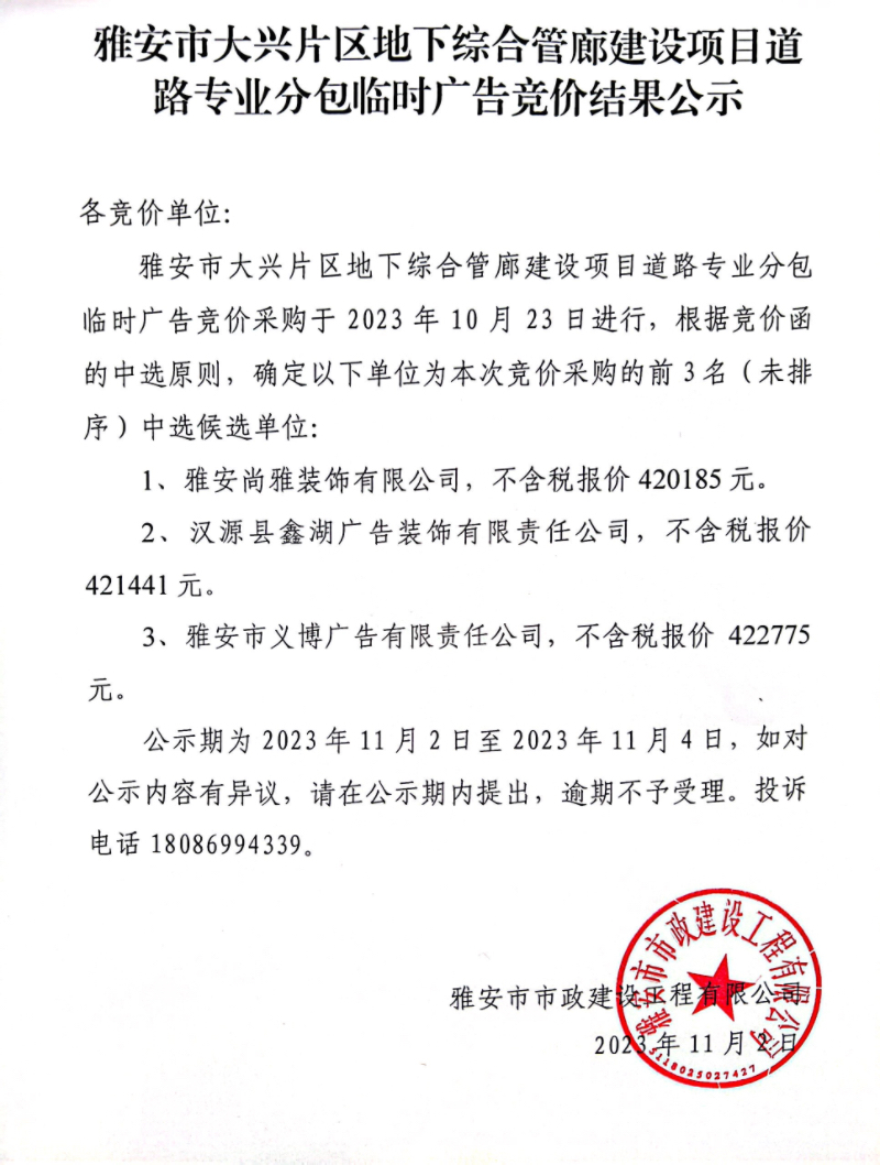 雅安市大興片區(qū)地下綜合管廊建設(shè)項目道路專業(yè)分包臨時廣告競價結(jié)果公示