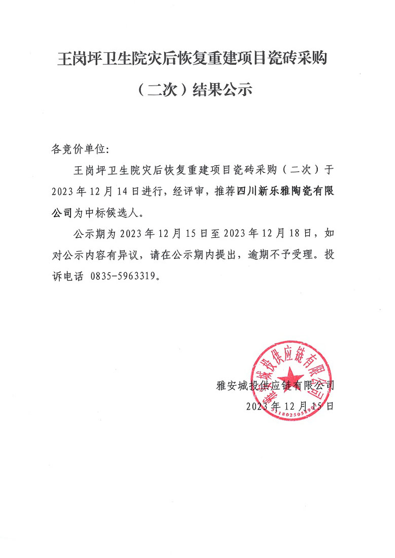 王崗坪衛(wèi)生院災后恢復重建項目瓷磚采購(二次)結果公示