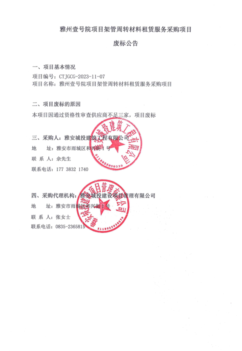 雅州壹號項目架管周轉(zhuǎn)材料租賃服務(wù)采購項目廢標(biāo)公告