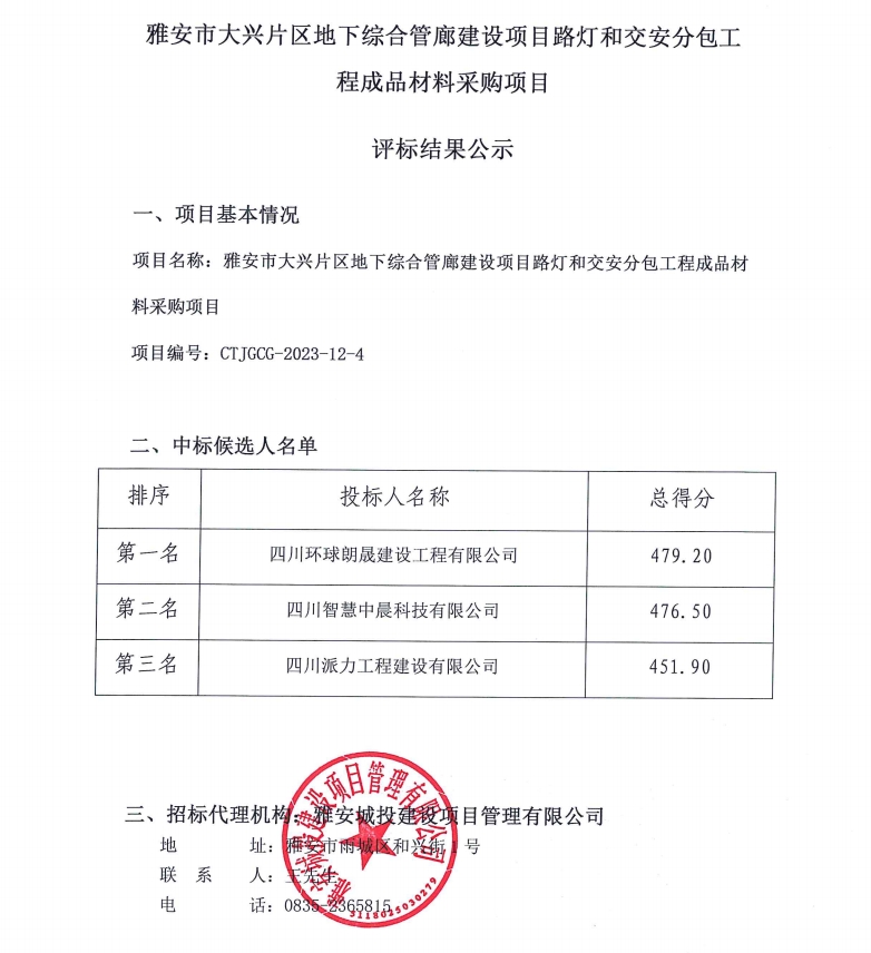 雅安市大興片區(qū)地下綜合管廊建設項目路燈和交安分包工程成品材料采購項目評標結(jié)果公示