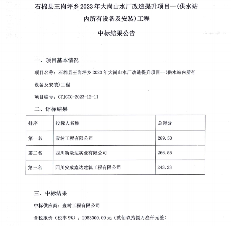 石棉縣王崗坪鄉(xiāng)2023年大崗山水廠(chǎng)改造提升項(xiàng)目--(供水站內(nèi)所有設(shè)備及安裝)工程中標(biāo)結(jié)果公告