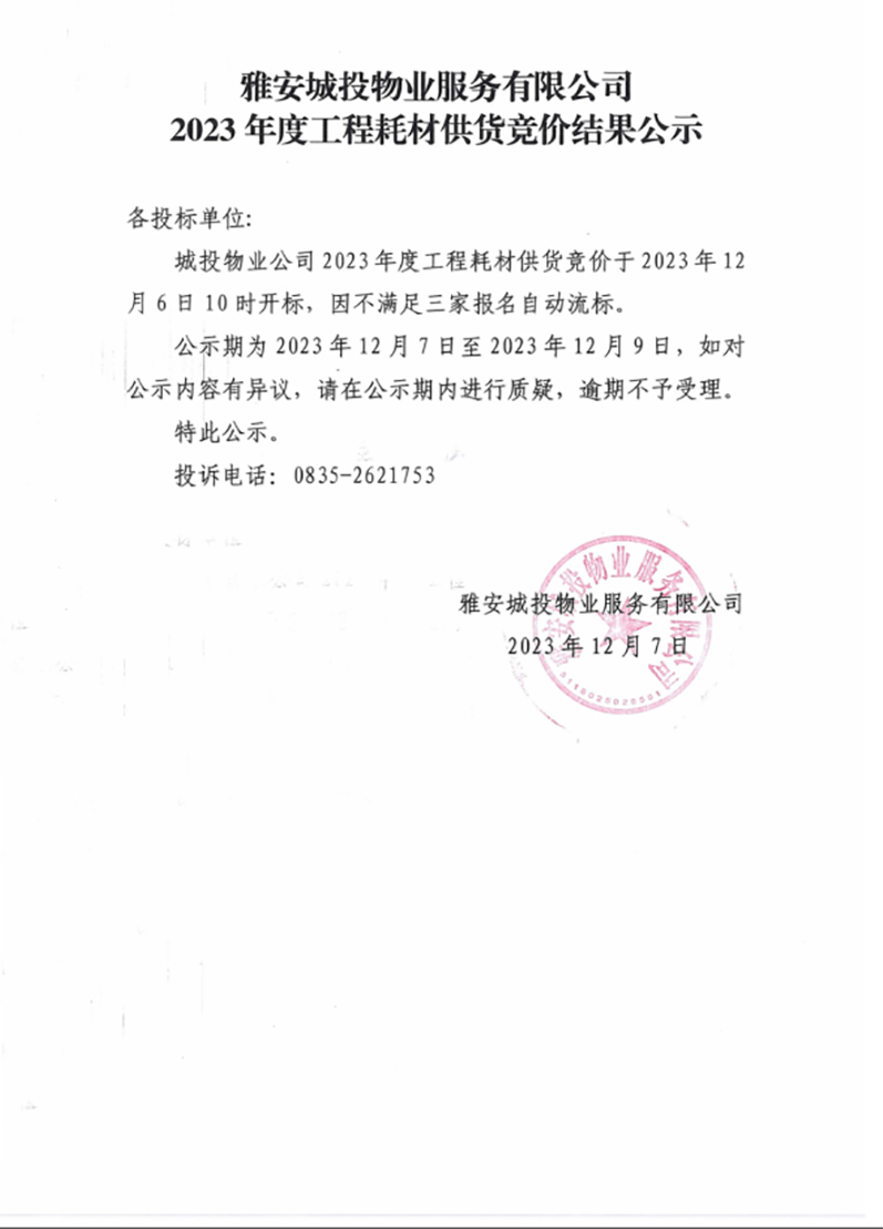 雅安城投物業(yè)服務(wù)有限公司2023年度工程耗材供貨競(jìng)價(jià)結(jié)果公示