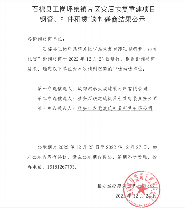 “石棉縣王崗坪集鎮(zhèn)片區(qū)災(zāi)后恢復(fù)重建項(xiàng)目鋼管、扣件租賃”談判磋商結(jié)果公示