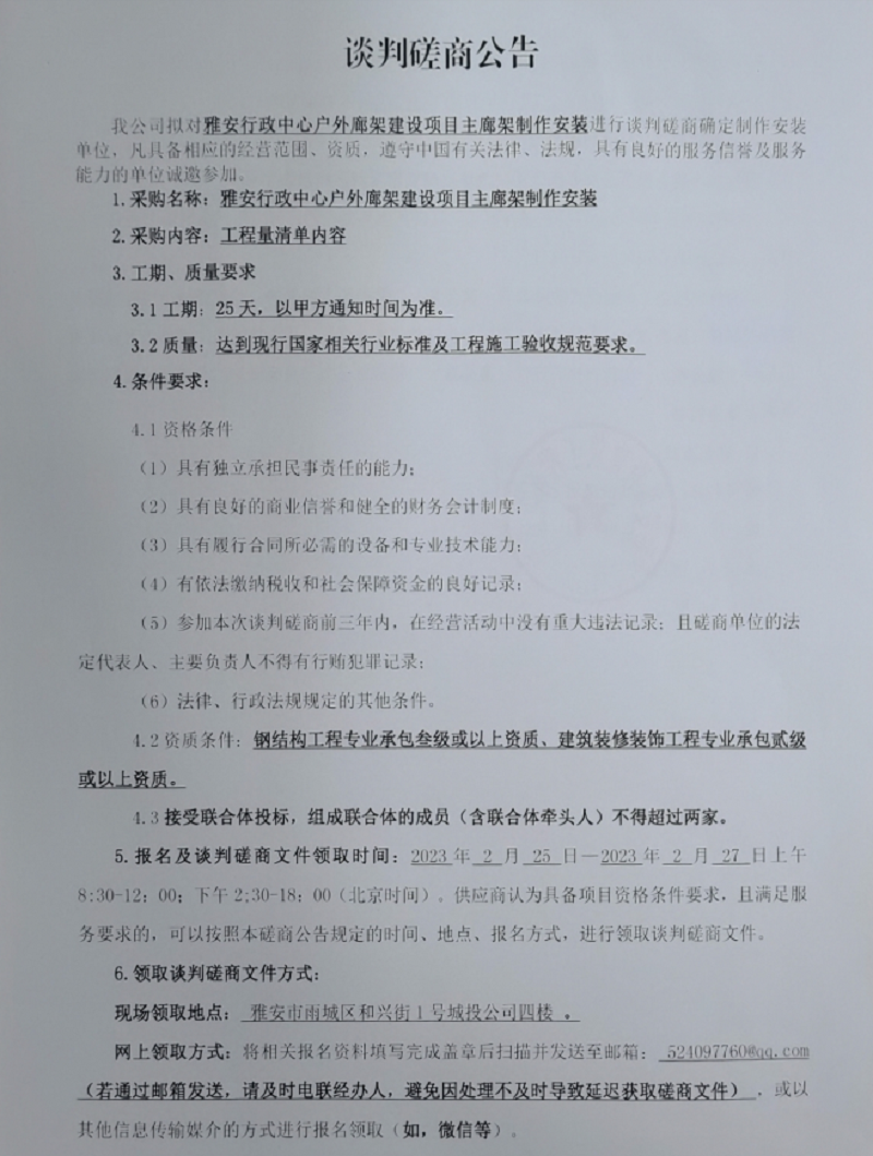 雅安行政中心戶外廊架建設(shè)項(xiàng)目主廊架制作安裝談判磋商公告