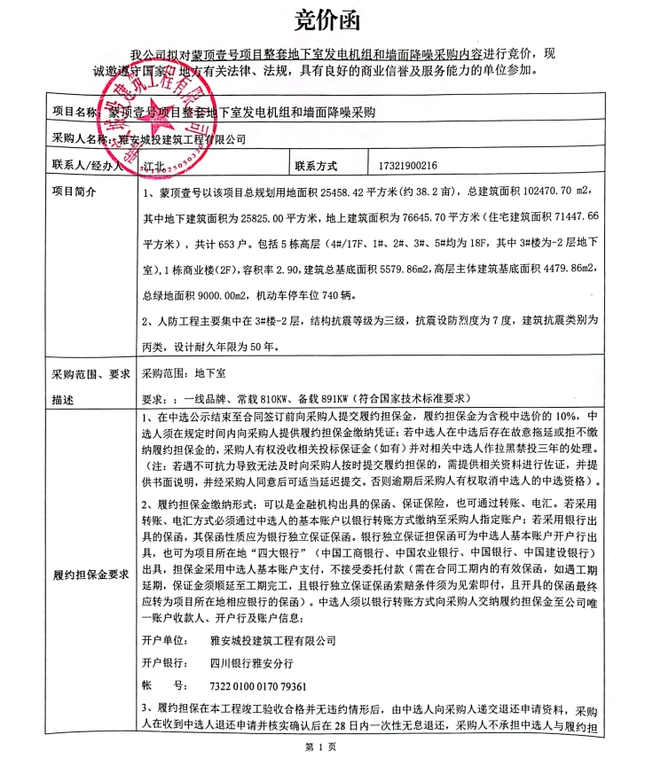 蒙頂壹號項(xiàng)目整套地下室發(fā)電機(jī)組和墻面降噪采購競價公告