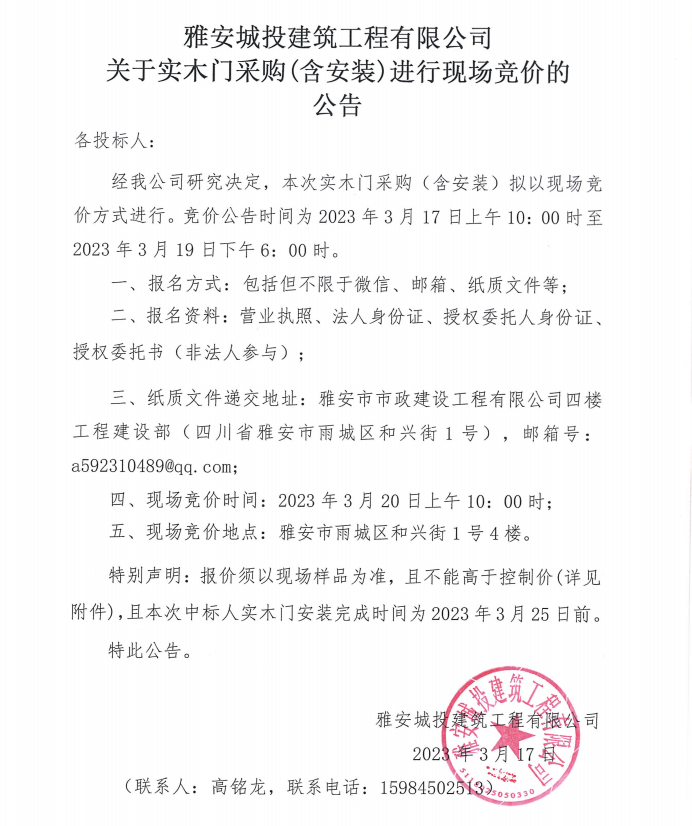 雅安城投建筑工程有限公司關(guān)于實(shí)木門采購(含安裝)進(jìn)行現(xiàn)場競價(jià)的公告