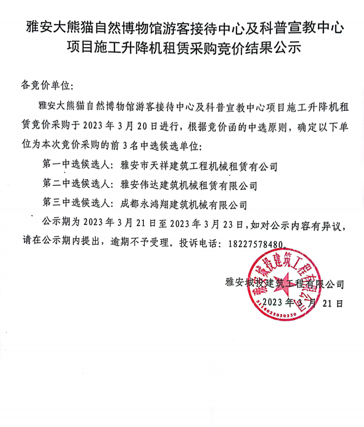 雅安大熊貓自然博物館游客接待中心及科普宣教中心項(xiàng)目施工升降機(jī)租賃采購競(jìng)價(jià)結(jié)果公示