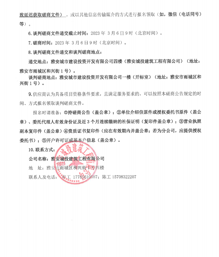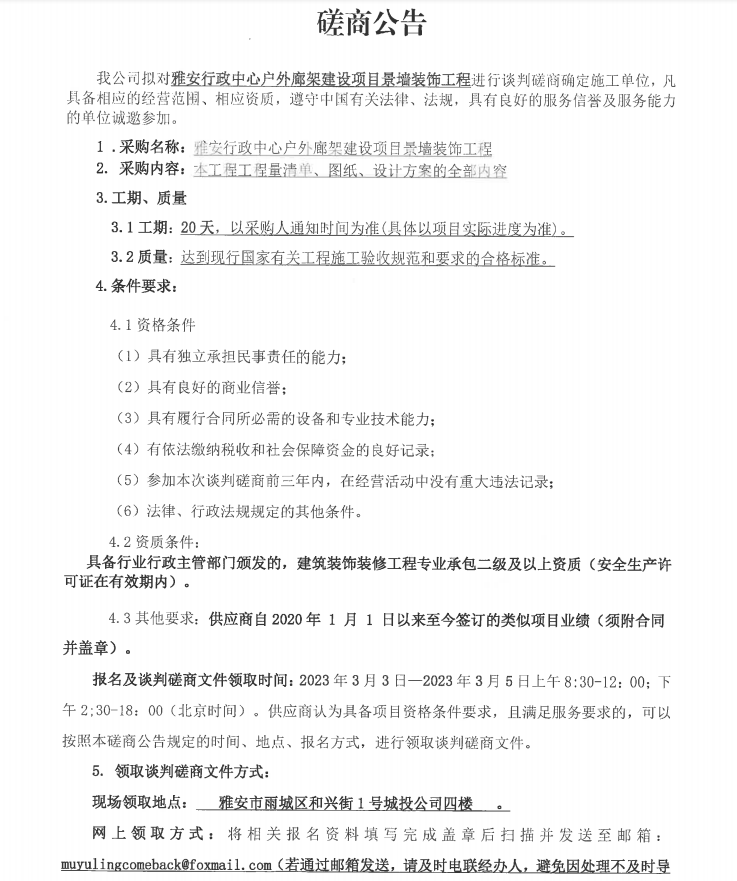 雅安行政中心戶外廊架建設(shè)項(xiàng)目景墻裝飾工程談判磋商公告