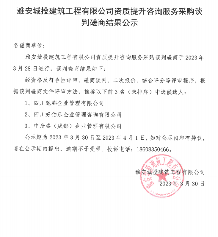 雅安城投建筑工程有限公司資質(zhì)提升咨詢(xún)服務(wù)采購(gòu)談判磋商結(jié)果公示