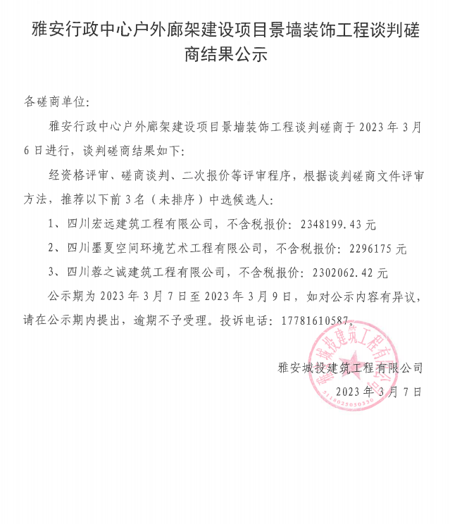雅安行政中心戶外廊架建設(shè)項(xiàng)目景墻裝飾工程談判磋商結(jié)果公示