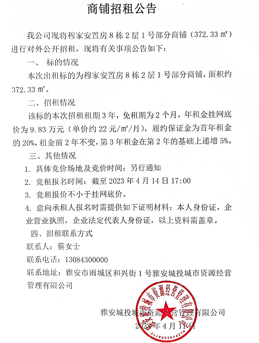 穆家安置房8棟2層1號(hào)部分商鋪招租公告