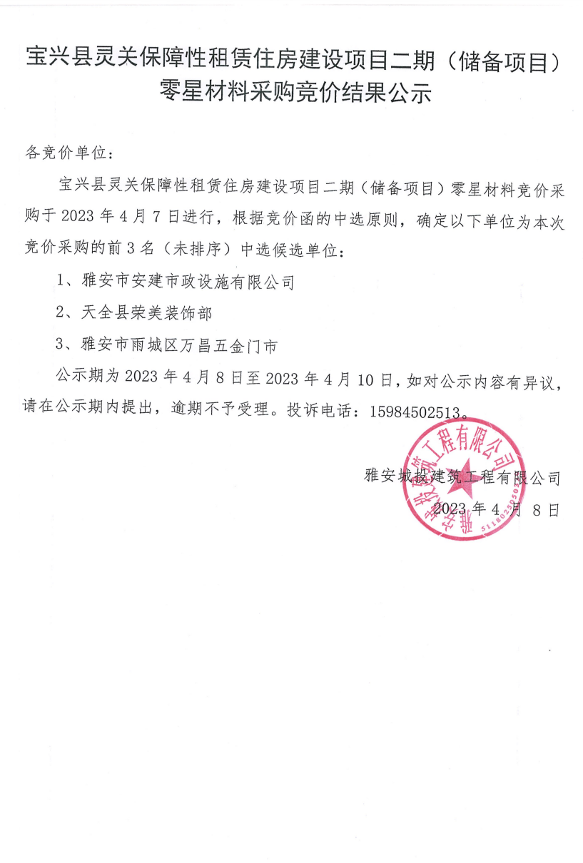 寶興縣靈關(guān)保障性租賃住房建設(shè)項目二期(儲備項目)零星材料采購競價結(jié)果公示