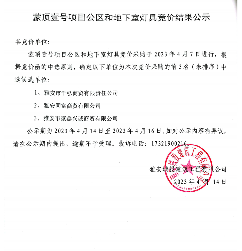 蒙頂壹號項(xiàng)目公區(qū)和地下室燈具競價結(jié)果公示