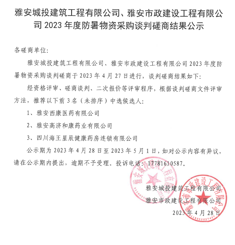 雅安城投建筑工程有限公司、雅安市政建設(shè)工程有限公司2023年度防暑物資采購談判磋商結(jié)果公示