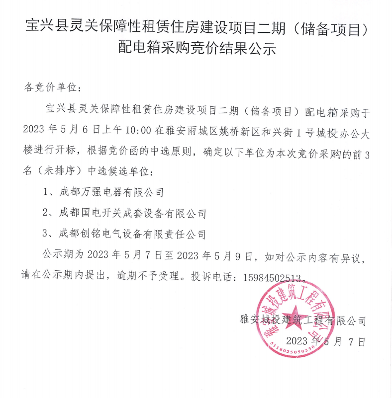 寶興縣靈關(guān)保障性租賃住房建設(shè)項(xiàng)目二期(儲(chǔ)備項(xiàng)目)配電箱采購(gòu)競(jìng)價(jià)結(jié)果公示
