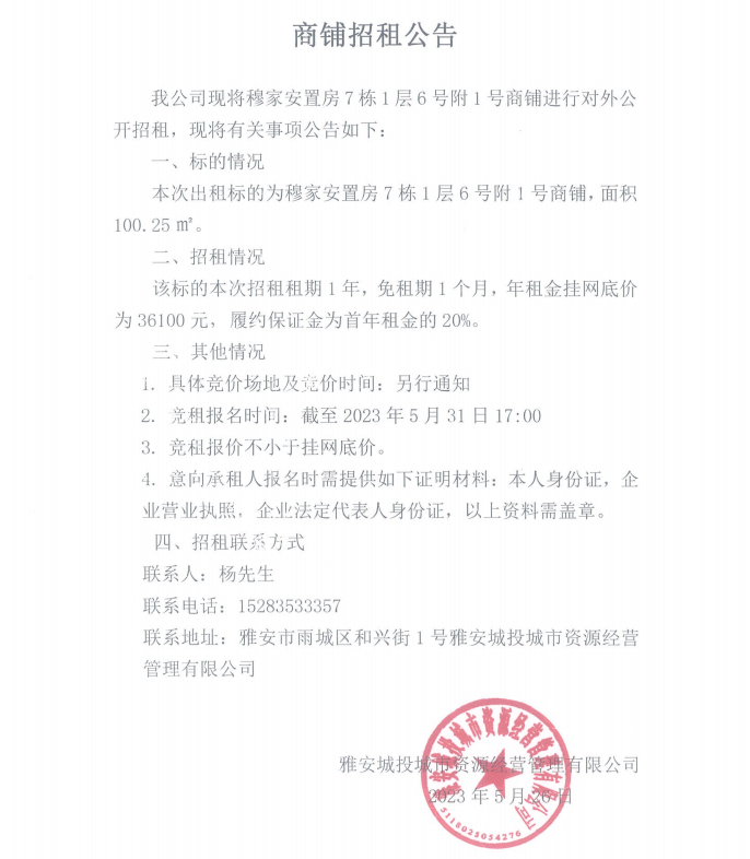 穆家安置房7棟1層6號附1號商鋪招租公告