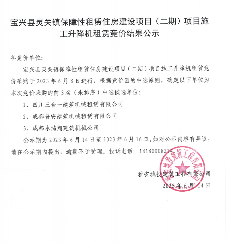 寶興縣靈關(guān)鎮(zhèn)保障性租賃住房建設(shè)項目(二期)項目施工升降機租賃競價結(jié)果公示