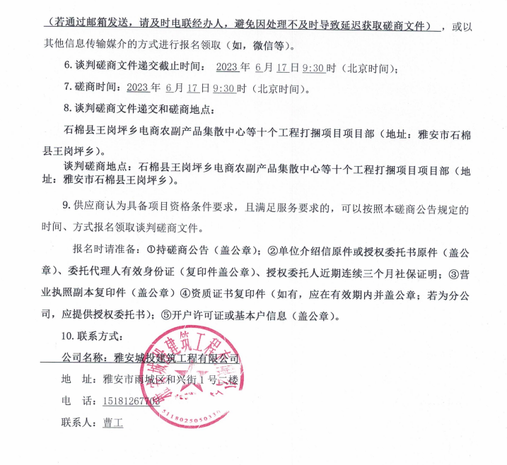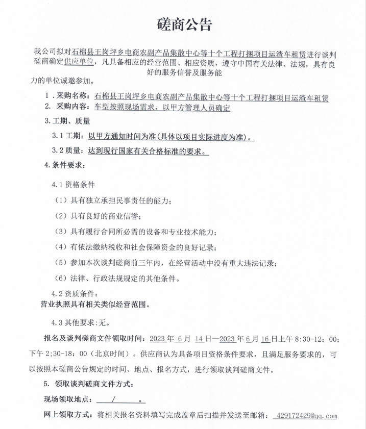 石棉縣王崗坪鄉(xiāng)電商農(nóng)副產(chǎn)品集散中心等十個工程打捆項目運渣車租賃談判磋商公告