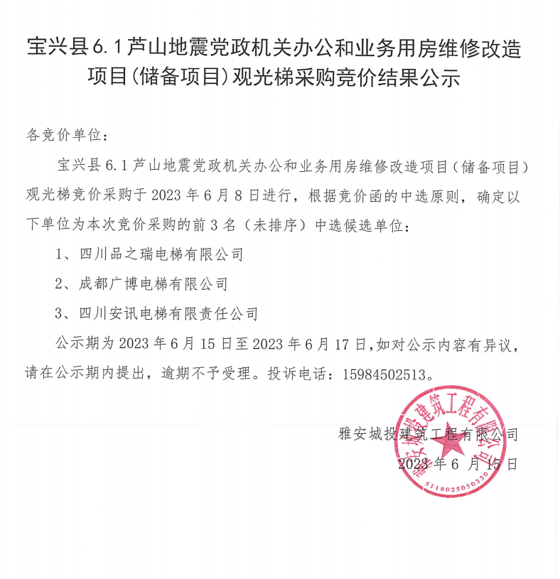 寶興縣6.1蘆山地震黨政機(jī)關(guān)辦公和業(yè)務(wù)用房維修改造項(xiàng)目(儲(chǔ)備項(xiàng)目)觀光梯采購競(jìng)價(jià)結(jié)果公示