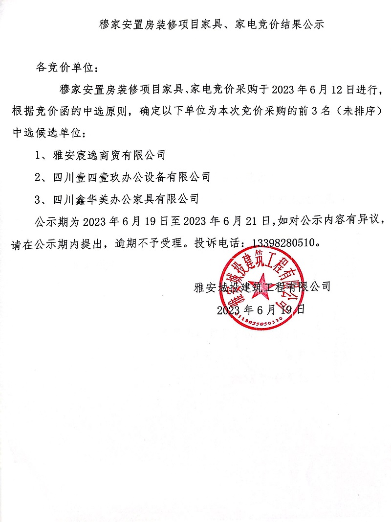 穆家安置房裝修項目家具、家電競價結果公示