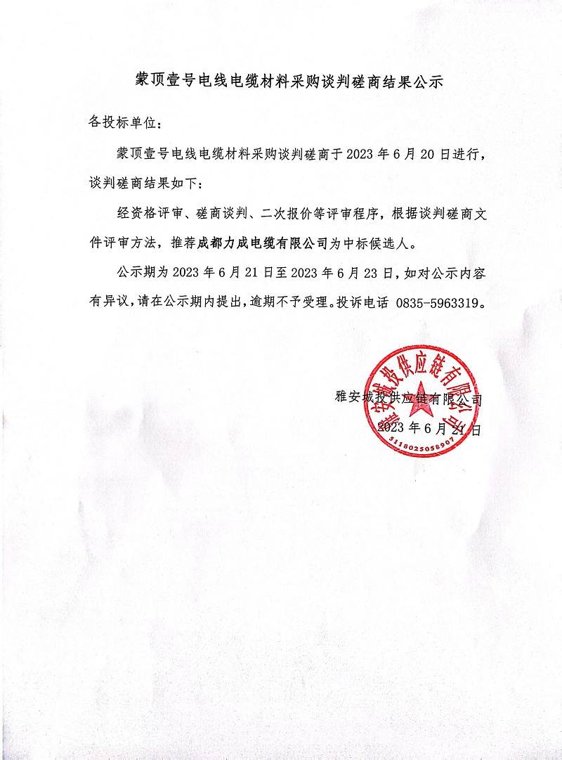 蒙頂壹號(hào)電線電纜材料采購(gòu)談判磋商結(jié)果公示