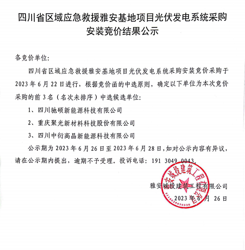 四川省區(qū)域應(yīng)急救援雅安基地項(xiàng)目光伏發(fā)電系統(tǒng)采購安裝競(jìng)價(jià)結(jié)果公示
