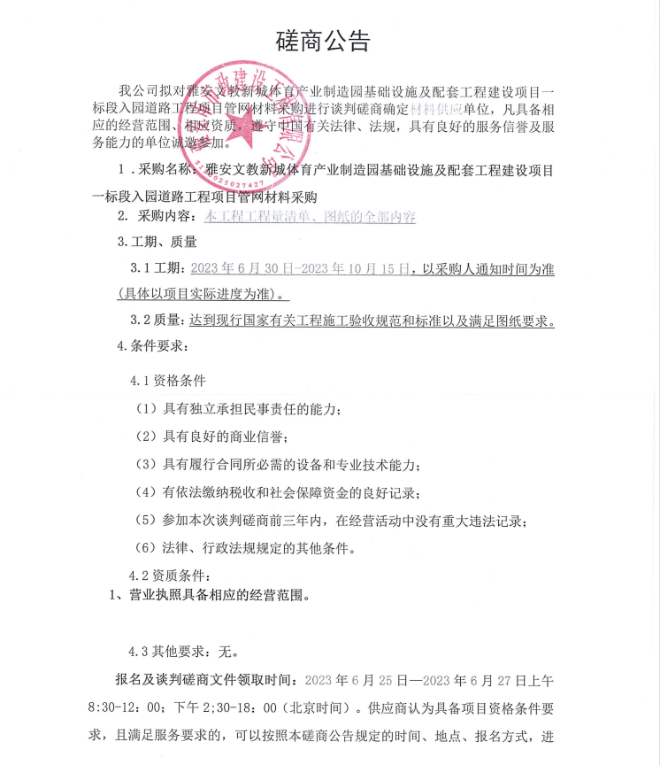 雅安文教新城體育產(chǎn)業(yè)制造園基礎(chǔ)設(shè)施及配套工程建設(shè)項目一標段入園道路工程項目管網(wǎng)材料采購談判磋商公告