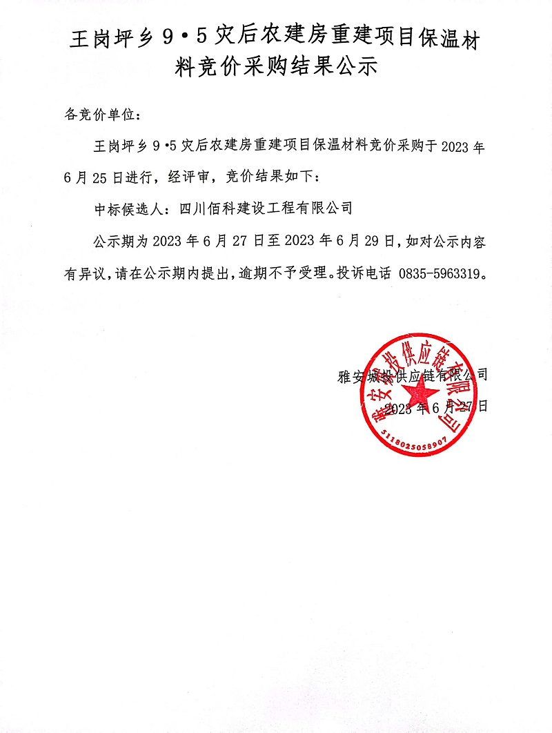 王崗坪鄉(xiāng)9·5災后農(nóng)建房重建項目保溫材料競價采購結果公示