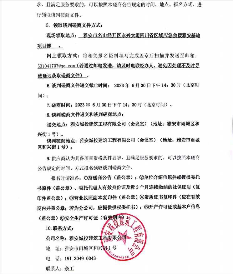 四川省區(qū)域應(yīng)急救援雅安基地項(xiàng)目高低壓配電工程施工分包談判磋商公告