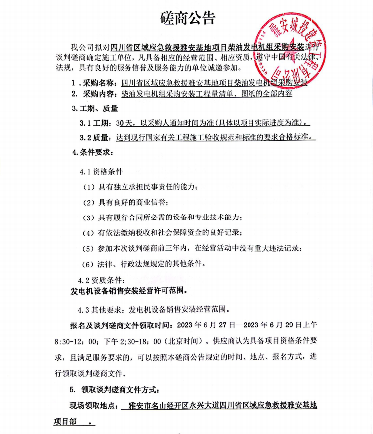四川省區(qū)域應(yīng)急救援雅安基地項目柴油發(fā)電機組采購安裝談判磋商公告