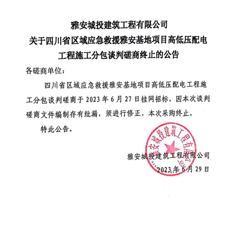 雅安城投建筑工程有限公司關于四川省區(qū)域應急救援雅安基地項目高低壓配電工程施工分包談判磋商終止的公告