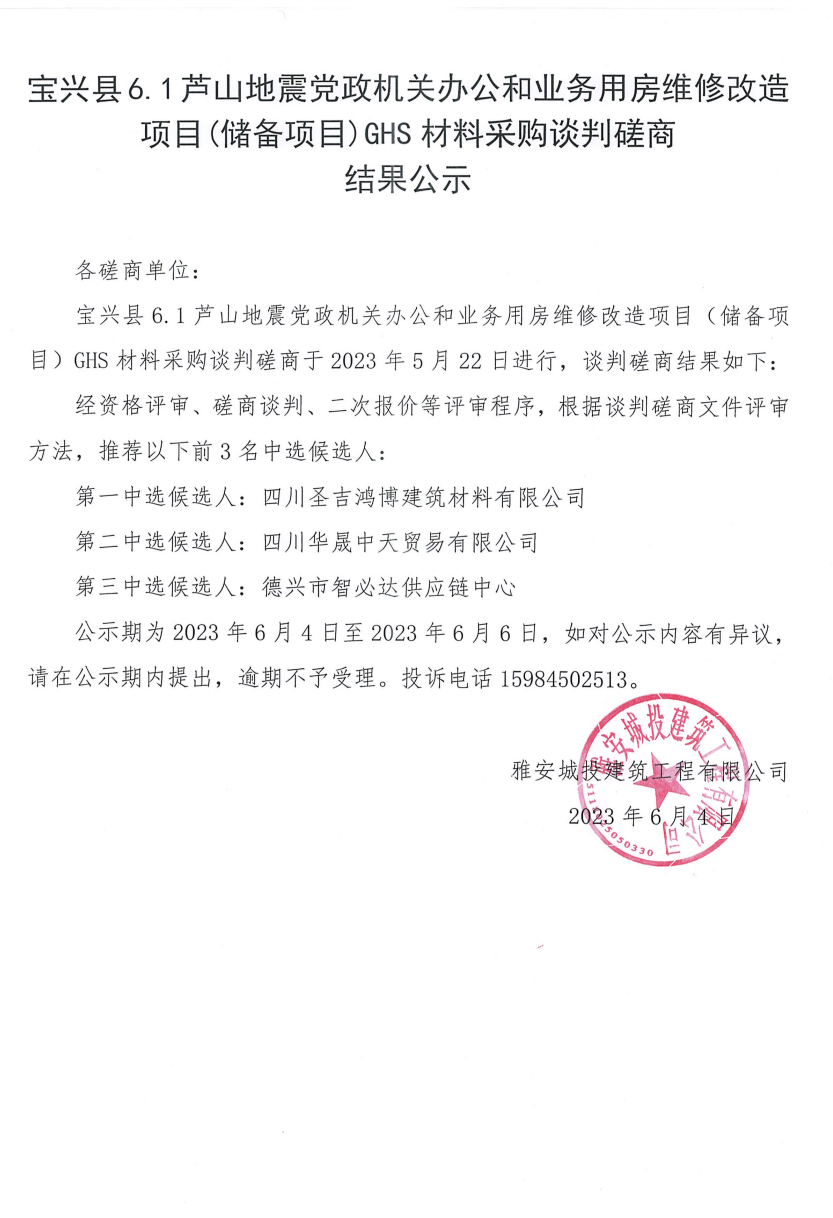 寶興縣6.1蘆山地震黨政機(jī)關(guān)辦公和業(yè)務(wù)用房維修改造項(xiàng)目(儲(chǔ)備項(xiàng)目)GHS材料采購談判磋商結(jié)果公示