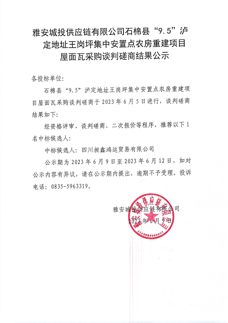 雅安城投供應(yīng)鏈有限公司石棉縣“9.5”瀘定地址王崗坪集中安置點農(nóng)房重建項目屋面瓦采購談判磋商結(jié)果公示